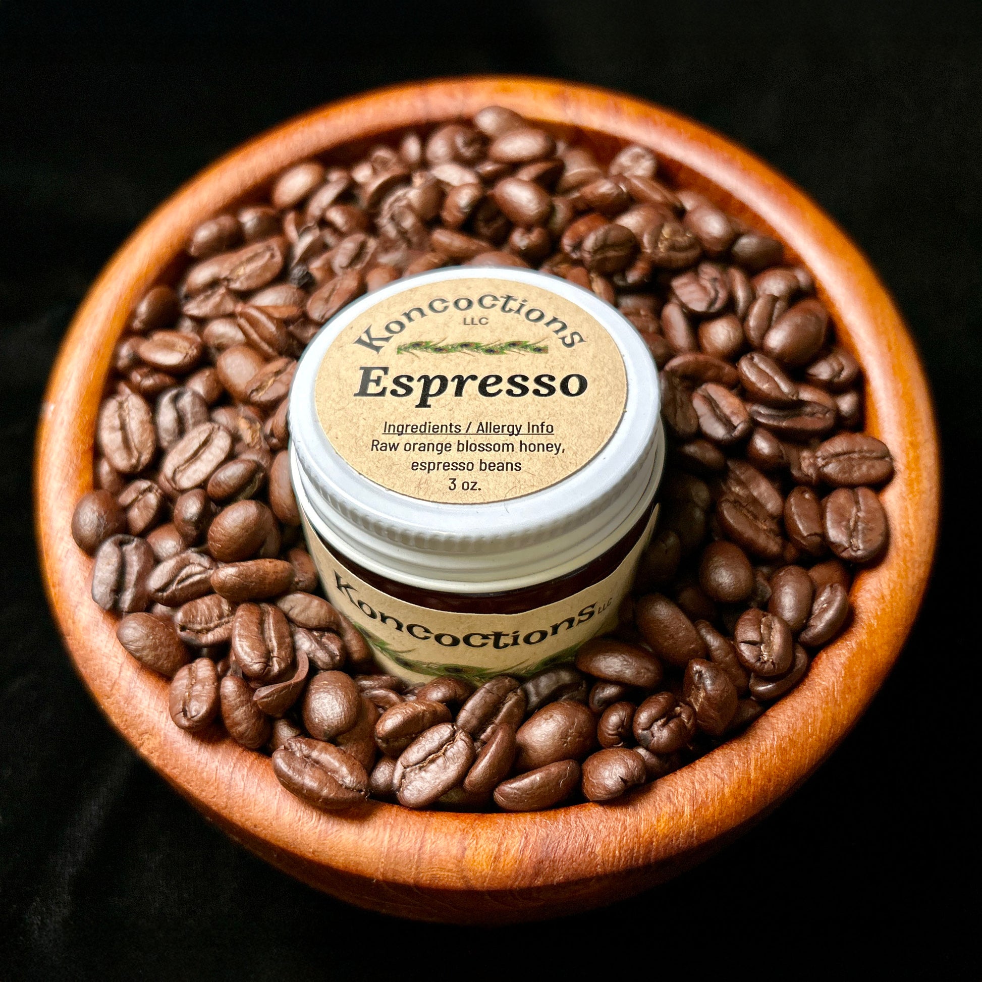 3 oz. glass jar raw orange blossom honey infused with smooth, low-acid espresso beans for a rich, aromatic blend of bold coffee flavor and natural sweetness.