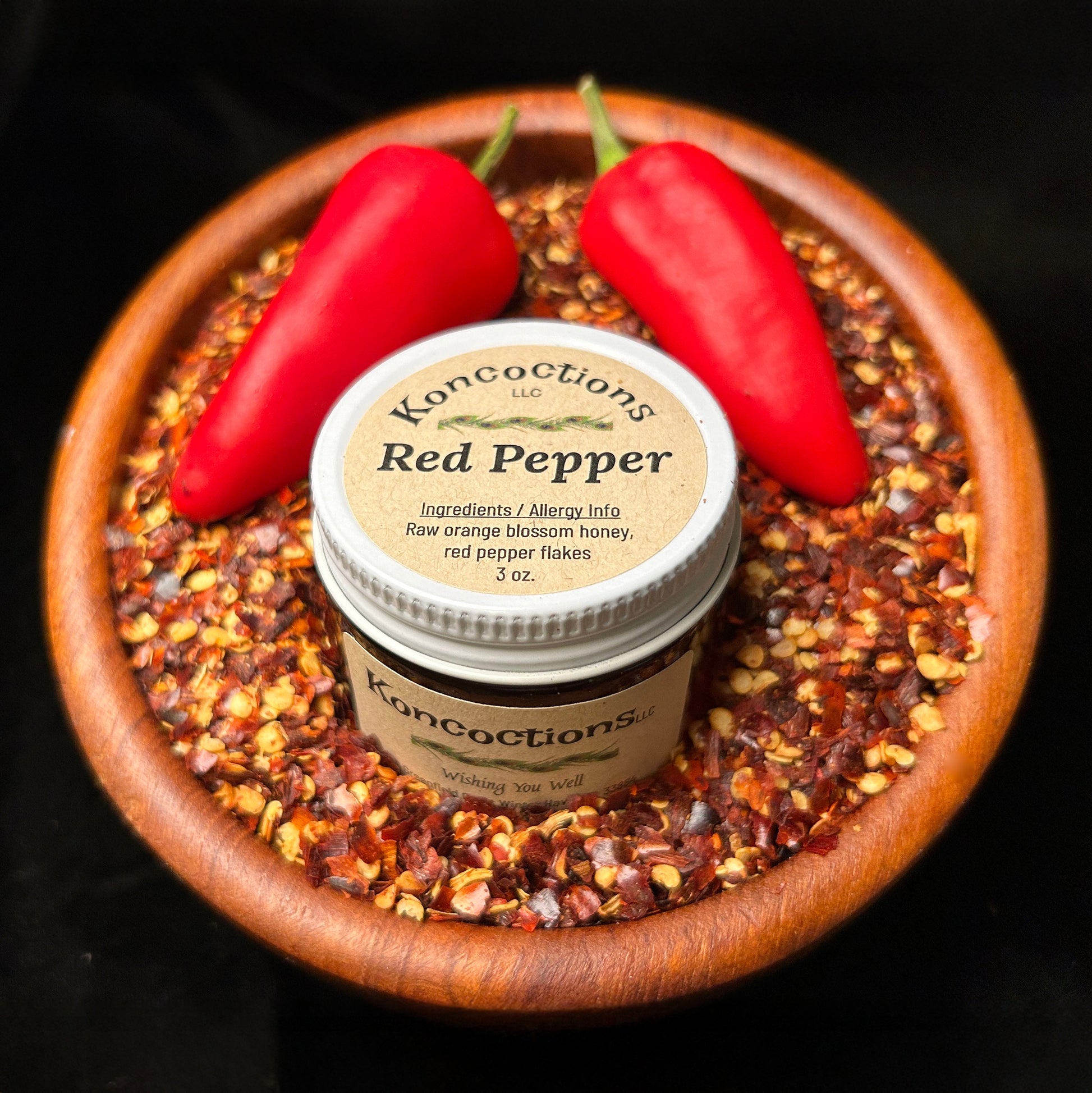 3 oz. glass jar raw orange blossom honey infused with crushed red pepper flakes for a sweet heat that lingers. A bold, spicy twist on a Southern classic.